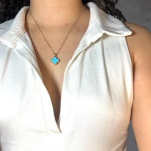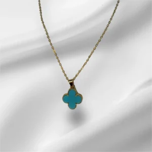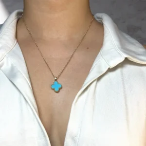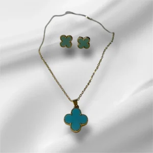 Add a pop of color and elegance to your jewelry collection with our Turquoise Blue Four-Petal Flower Necklace and Earrings Set. This stunning set features a beautifully crafted four-petal flower design in a vibrant turquoise blue, perfectly complemented by a gold stainless steel finish. The set includes a delicate necklace with a matching pair of earrings, creating a cohesive and stylish look that’s perfect for any occasion.