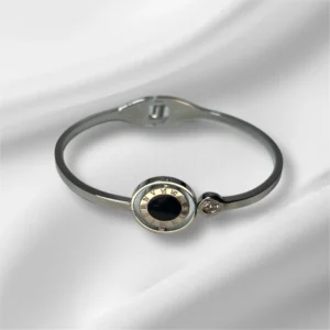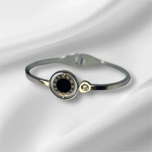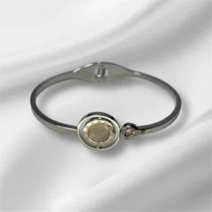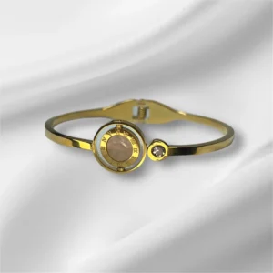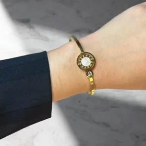 Q: What is the material of the bracelet? A: The bracelet is made of high-quality stainless steel with a Mica Shell inlay and is available in both gold and silver finishes.
