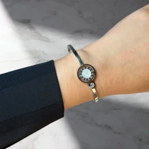 Q: What makes this bracelet’s design unique? A: The bracelet features a reversible pendant with a Mica Shell inlay on one side and a Roman numeral design on the other, allowing you to wear it on either side for two different looks.