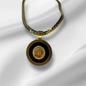 Celebrate life and heritage with our Gold Stainless Steel Tree of Life Necklace, a symbolic piece that exudes both elegance and cultural significance. This exquisite necklace features a beautifully crafted Tree of Life pendant, intricately adorned with sparkling zirconia stones. The pendant is framed by a classic Greek key design, adding a touch of historical charm to this modern accessory.