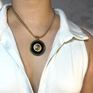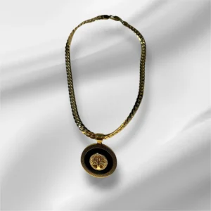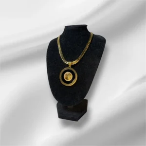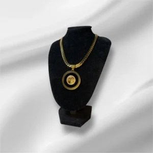 The necklace comes with a thick, durable chain, made from premium stainless steel with a luxurious gold finish, ensuring both a bold look and long-lasting wear. The combination of the striking pendant and the robust chain makes this piece a perfect statement accessory, whether you’re enhancing your everyday style or adding a meaningful piece to your jewelry collection.